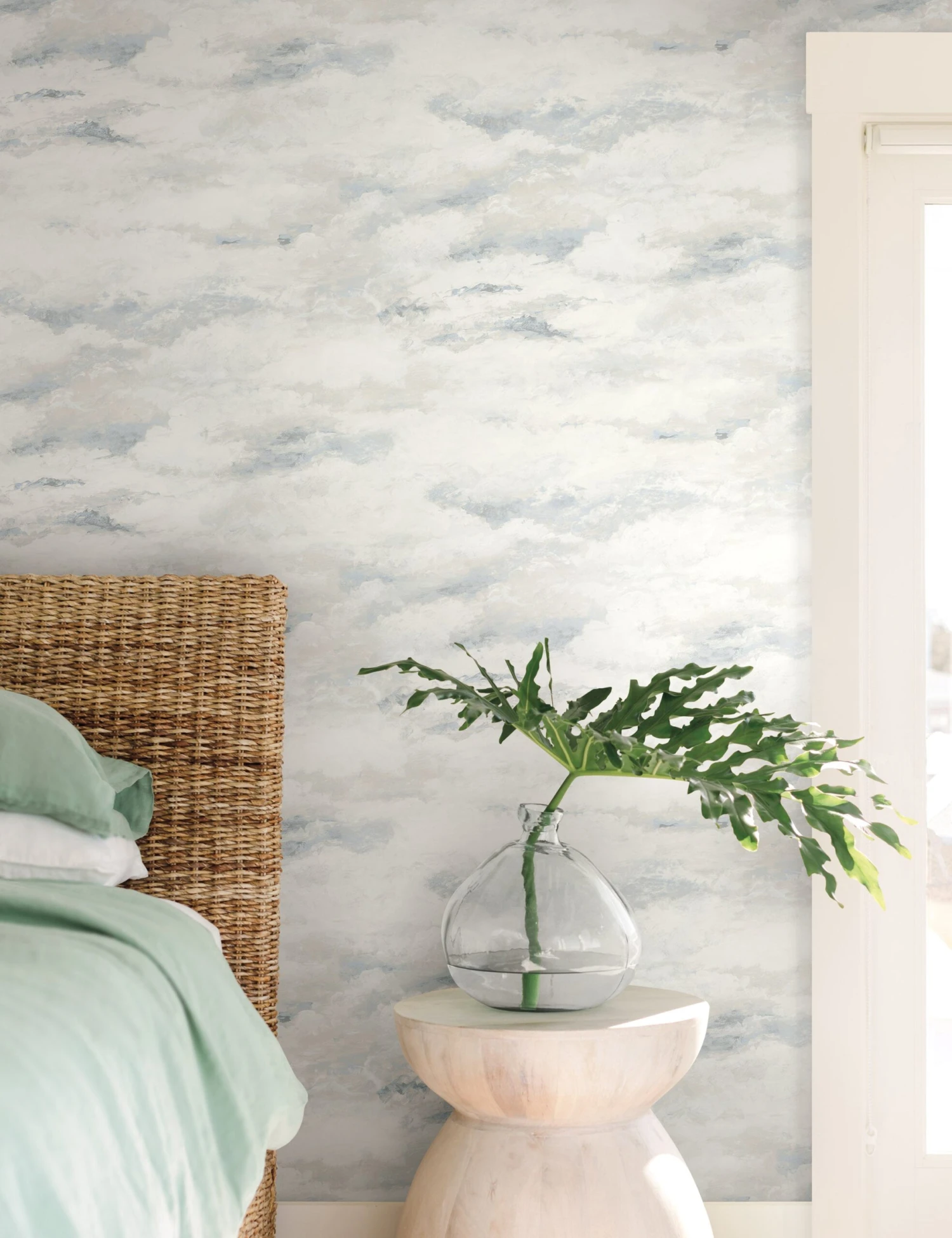 A billowy, cloud-filled sky imbues this wallpaper with a soft, painterly air. We love the transitional appeal of this home wallpaper when styled as a serene treatment for a thoughtfully refined bedroom or lounge.